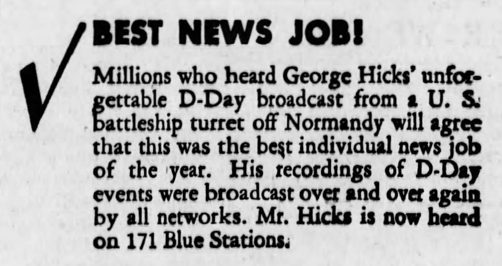 “The nation’s radio editors and critics heaped great praise on George Hicks of the Blue Network for his handling of reports from the invasion beachhead in Normandy on D-Day, reports which were carried on all networks,” Motion Picture Daily wrote in announcing the poll results in its December 8 issue. “Their vote is that his was the best individual news job performed in radio in 1944.”