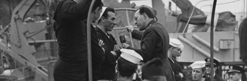 As the final minutes of the day the world had anticipated for years ticked away, George Hicks went topside on the USS Ancon to record a summary of what he had seen and heard on D-Day. The 38-year-old Blue Network correspondent lugged a 50-pound Recordgraph film recorder to the deck and set up near one of the Ancon‘s four twin 40mm antiaircraft gun mounts.