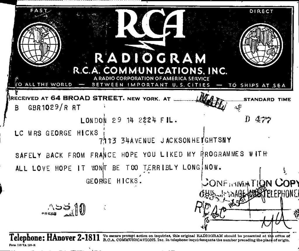 It was about this time, as he returned to the Blue Network offices in London, that he began to get a grasp for the impact his broadcast had made. The network, a former arm of NBC that was still finding its feet as an independent entity, was ecstatic. (Blue would become the American Broadcasting Company, ABC, in June 1945). On June 30, the network sent Anne Hicks a check for $1,000 (nearly $15,000 today) as a bonus for her husband’s “wonderful and loyal service.”