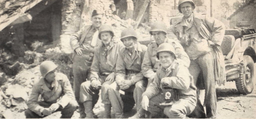 The group, which also included star AP correspondents Hal Boyle and Don Whitehead, posed for a group photo to mark the occasion. At some point during the visit, Irvin — who had flown over the invasion beaches on D-Day and been in France since June 8 — told Bunnelle and Stratton that his only complaint was not seeing enough action.