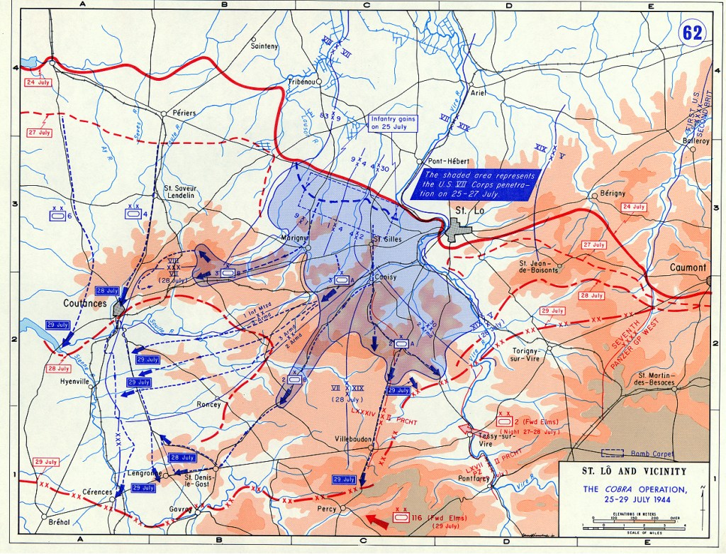 In an effort to give the attack by the U.S. VII Corps the best possible chance of success, planners ordered heavy aerial bombardment on German positions south of the Périers-Saint-Lô road (the dashed rectangle in the map below) to soften up the defenses. The plan included fighter-bombers accustomed to close air support but also heavy bombers that were not used to such precision work.