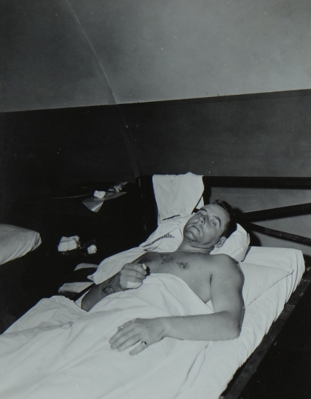 Unmindful of the hardship involved, Dr. Haynes swam from group to group, cautioned them against drinking sea water, gave other instructions and boosted morale for an ultimate rescue. At the same time he tried to administer what first aid he could, without supplies, to the burned and wounded. He was clad only in the bottom of half of his pajamas, but he took this off and tore it into strips to dress wounds. He had men lock arms and tried to keep them together.