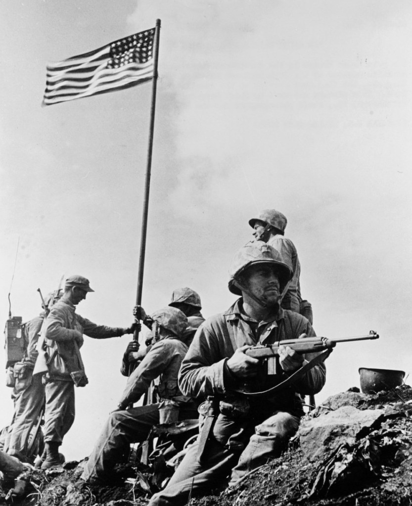 The casualties already had been horrific by that point — “the most costly fight in which the Marines have ever been engaged,” as AP correspondent Elmont Waite put it in a story filed that day. He was writing from Guam, headquarters of Adm. Chester Nimitz’s Pacific fleet, but his second paragraph mentioned what would be the enduring image of the day: “The Stars and Stripes were raised over the volcanic Suribachi fortress 97 hours after the costly invasion began.”